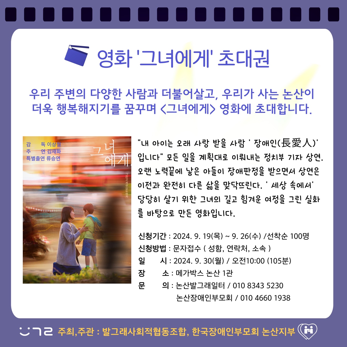 함께 영화 볼래요?!!! 오는 9/30(월) 오전에 발그래사회적협동조합 (이사장: 우리 학과 하주현 교수님)와 한국장애인부모회 논산지부가 함께 하는 영화 상영회 행사가 있습니다. 발달장애 자녀를 둔 어머니의 실화를 바탕으로 한 영화로 큰 울림과 감동을 주는 영화로 알려져 있어요. 김재화 배우님이 주인공 엄마로 나오시는데요. 우리 학과 1학년 학생들이 함께 영화 상영회에 참여합니다. 어떤 이야기가 펼쳐질지 많이 궁금하시죠? 얼른 신청하세요~~
