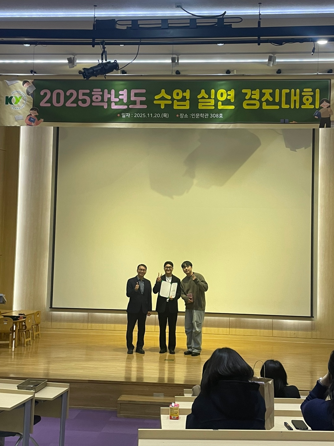 건양대학교 교육과와 교직과정에서 함께 하는 수업실연경진대회가 열렸습니다. 매년 많은 학생들이 수업실연경진대회에 참여하는데요. 올해도 우리 특수교육과에서도 예선을 통과한 2팀이 본선에 진출하여 수업 실력을 뽐내었답니다. 이번 경진대회에는 논산계룡교육지원청의 양*규 장학사님께서 심사위원으로 참여해주셔서 키세들의 수업에 대한 피드백도 꼼꼼하게 해주셨답니다. 키세들의 수업전문성이 한뼘 더 자랐을거예요. 그리고 진지한 수업 참관의 태도와 친구들의 수업실연을 응원하는 손길까지... 역시 건양특교의 키세인들은 수업 사랑은 쭉~~ 이어집니다. 일시: 2025년 11월 20일 9:30-12:30 장소: 인문학관 3층 강당