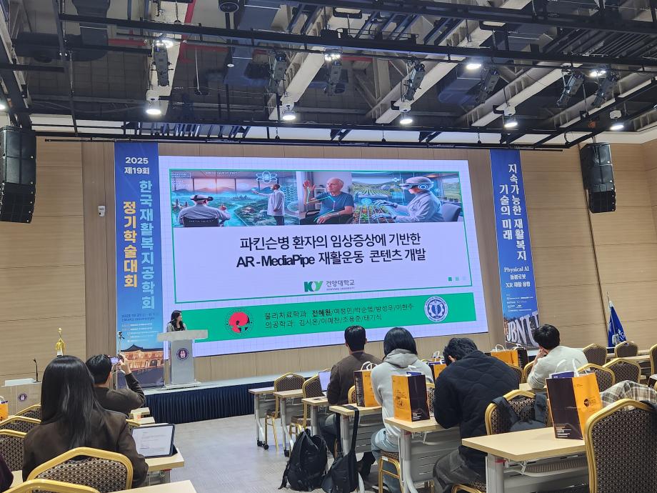 물리치료학과와 의공학과 연합팀이 ‘2025년 제19회 한국재활복지공학회 정기학술대회 학부생 논문경진대회’에서 대상과 우수상을 동시에 수상했다고 3일 밝혔다. 이번 학술대회는 지난 10월 31일 전북대학교 JBNU 컨벤션센터에서 개최됐으며, “지속가능한 재활복지기술의 미래: Physical AI·돌봅로봇·XR재활융합” 을 주제로 국내 재활복지공학 분야의 최신 기술과 연구 성과가 발표됐다. 대상 수상팀은 물리치료학과 전혜원·여정민·박순범·방성우 학생과 의공학과 김시온·이예찬·조용준 학생으로 구성됐으며, “파킨슨병 환자의 임상증상에 기반한 AR–MediaPipe 기반 인터랙티브 재활운동 콘텐츠 개발” (지도교수: 의공학과 태기식, 물리치료학과 이현주)이라는 주제로 연구를 진행했다. 본 연구는 파킨슨병 환자의 주요 증상인 운동완서(Bradykinesia), 안정 시 떨림(Tremor), 근육강직(Rigidity)에 초점을 맞춰, 맞춤형 재활훈련 콘텐츠를 개발한 것이 특징이다. 물리치료학과에서는 임상적 운동 특성을 분석하여 콘텐츠를 개발하고, 의공학과에서는 증강현실(AR) 기반 훈련게임 및 플랫폼을 구현해 환자 특성에 따른 재활효과를 검증했다. 이와 같은 융합 연구는 기술적 창의성과 임상적 실용성을 모두 인정받아 높은 평가를 받았다. |