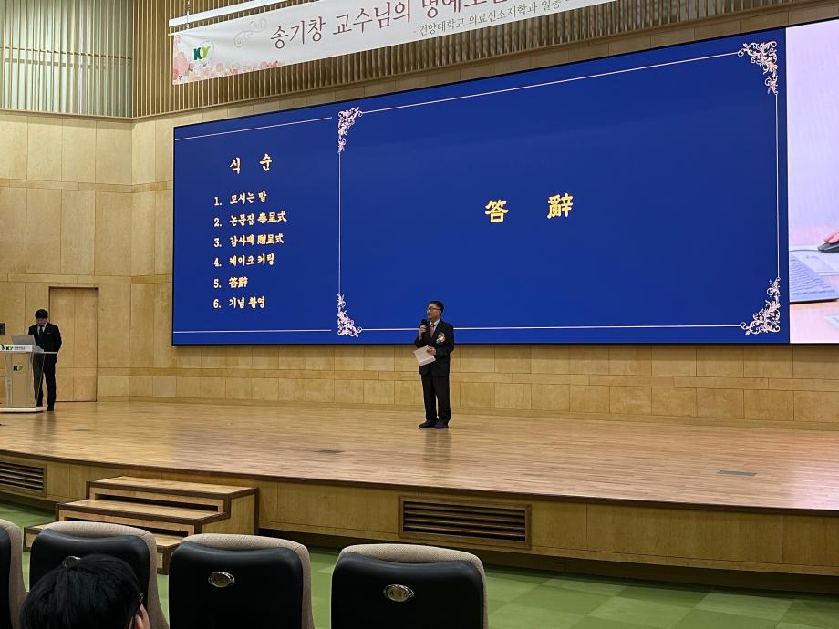 1. 행사명 : 송기창 교수님 정년퇴임식 2. 일시 : 2025.11.27(목) 3. 장소 : 메디컬캠퍼스 죽헌정보관 5층 리버럴아츠홀 4. 참석자 : 의료신소재학과 재학생 및 교원 |