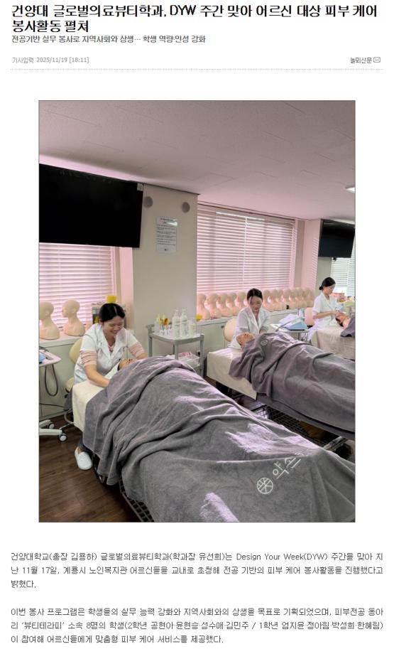 이번 글로벌의료뷰티학과에서는 수업이 없는 DYW 주간을 활용해 평소 수업에서 익힌 피부 테크닉을 실제 어르신들에게 적용하며 뷰티테라피 학생들은 봉사활동을 하는 의미 있는 시간을 보냈습니다^^