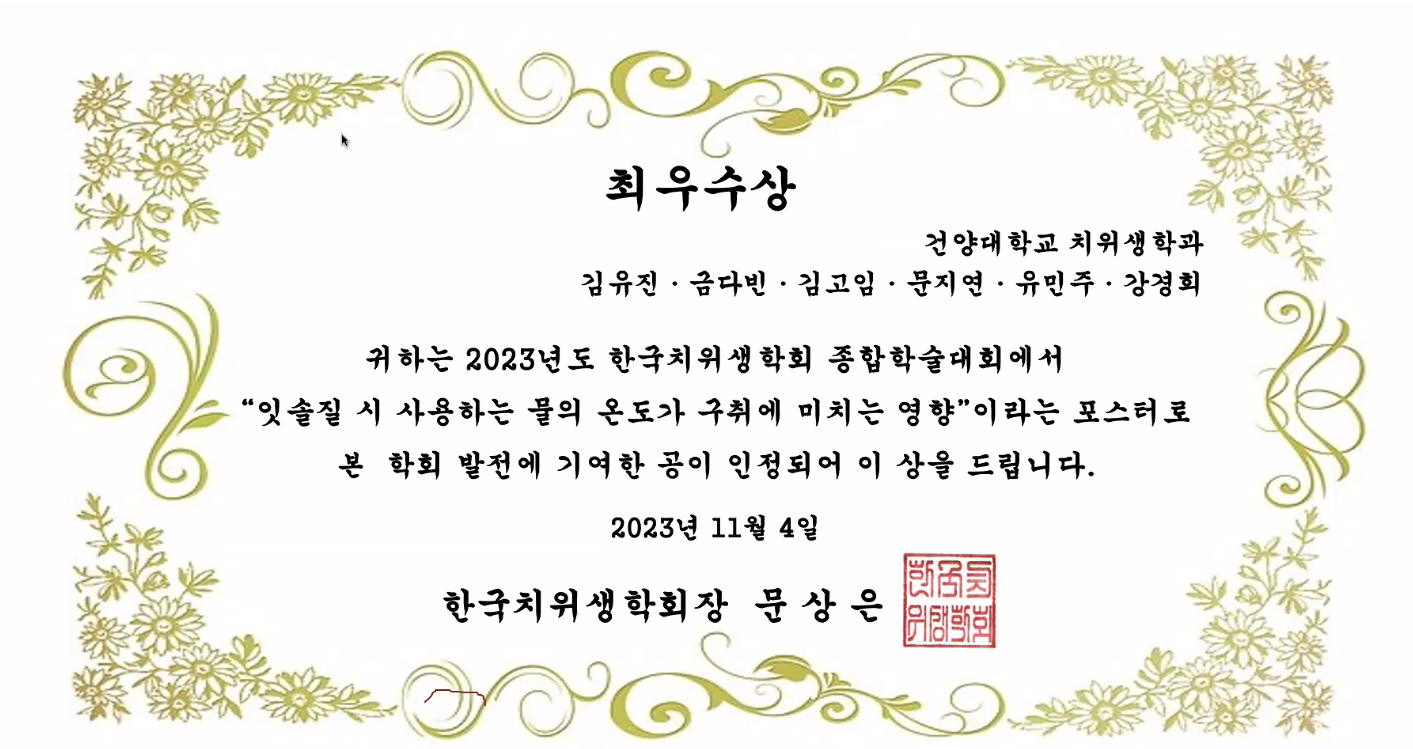 | 제목 | 한국치위생학회 종합학술대회 학생연구 및 교수연구 5팀 수상, (23년도 총 11개팀 수상) | ||||