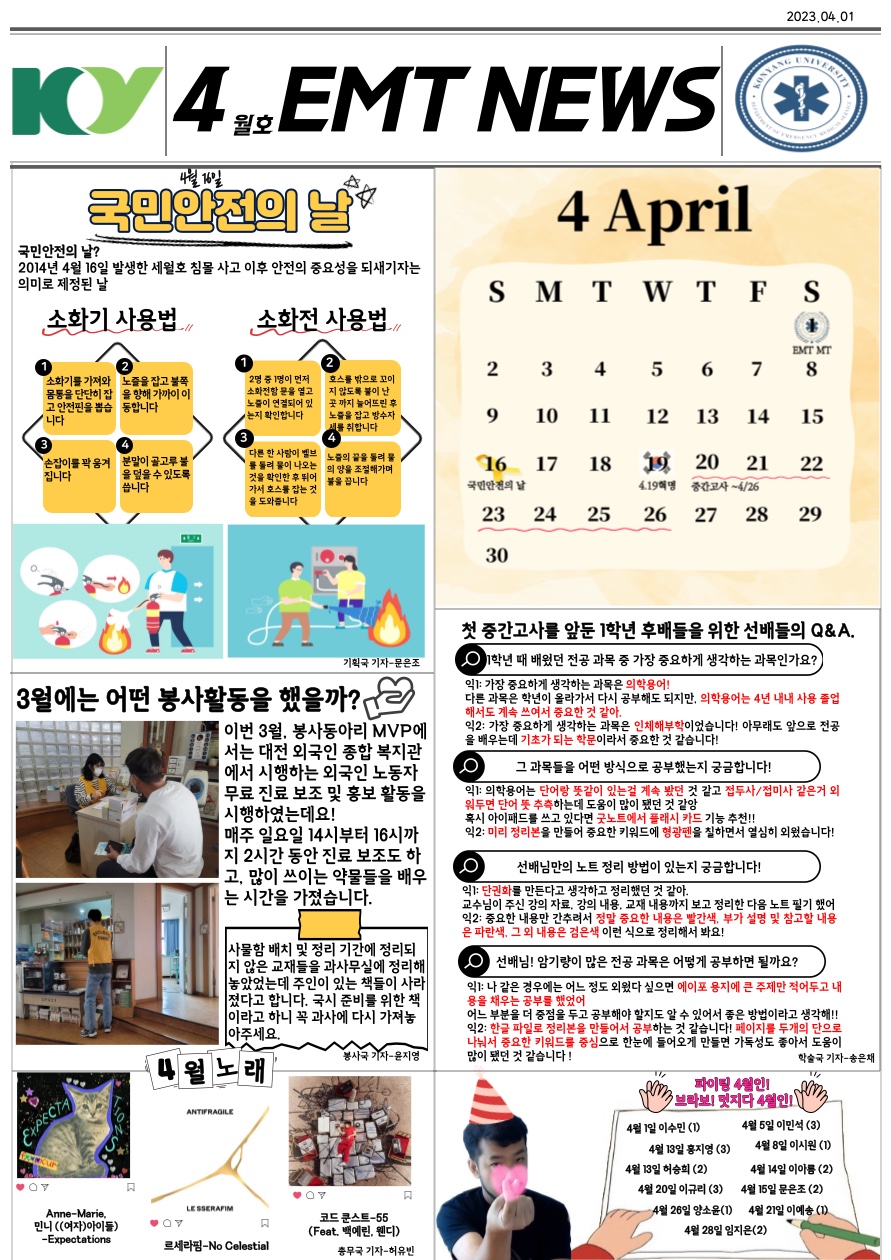 『 2023년 4월 EMT NEWS 』글의 상세내용을 확인하는 표로 제목, 부서명, 등록일, 조회, 첨부, 내용으로 나뉘어 설명합니다.