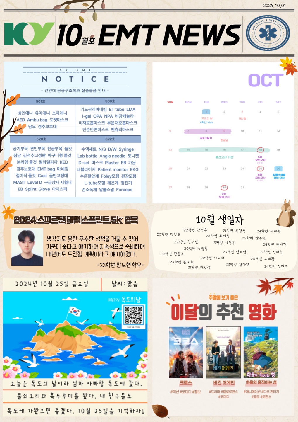 『 2024년도 10월 EMT NEWS 』글의 상세내용을 확인하는 표로 제목, 부서명, 등록일, 조회, 첨부, 내용으로 나뉘어 설명합니다.