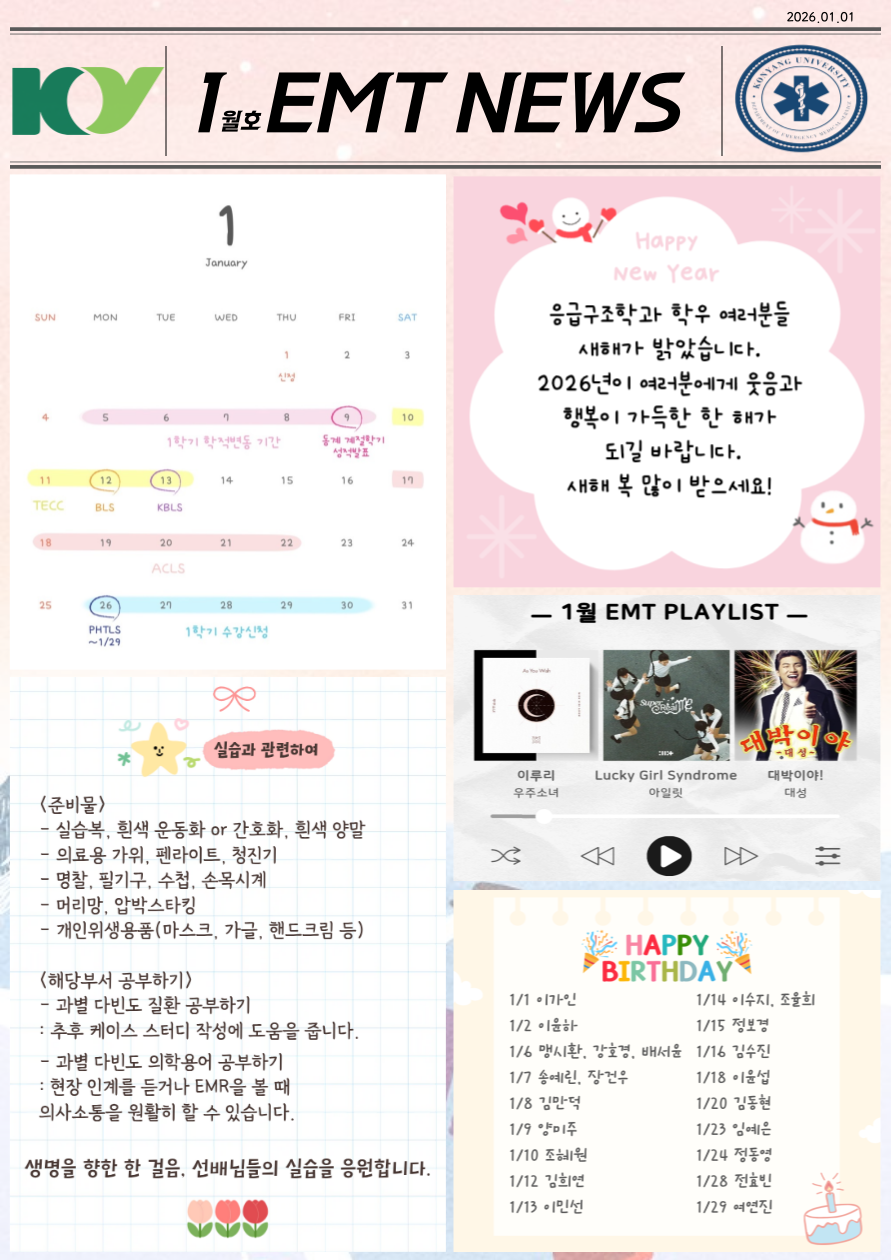 『 2026년도 1월 EMT NEWS 』글의 상세내용을 확인하는 표로 제목, 부서명, 등록일, 조회, 첨부, 내용으로 나뉘어 설명합니다.