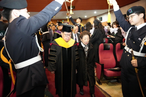 13일 오후 건양대 창의융합캠퍼스에서 열린 제31회 전기학위수여식 모습. 김희수 설립자 겸 명예총장과 김영이 사모가 입장하는 모습.JPG