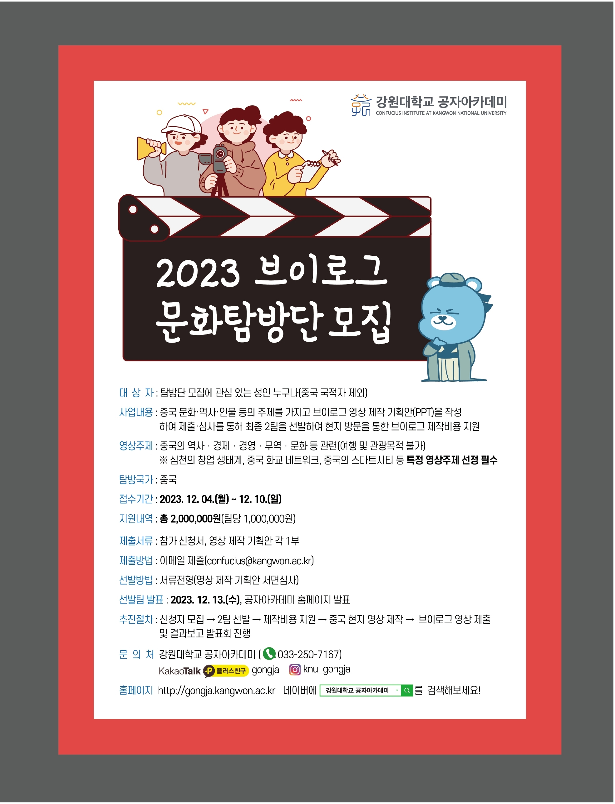 | 제목 | 강원대학교 공자아카데미 주최 '2023 브이로그 문화탐방단' 모집 안내 | ||||