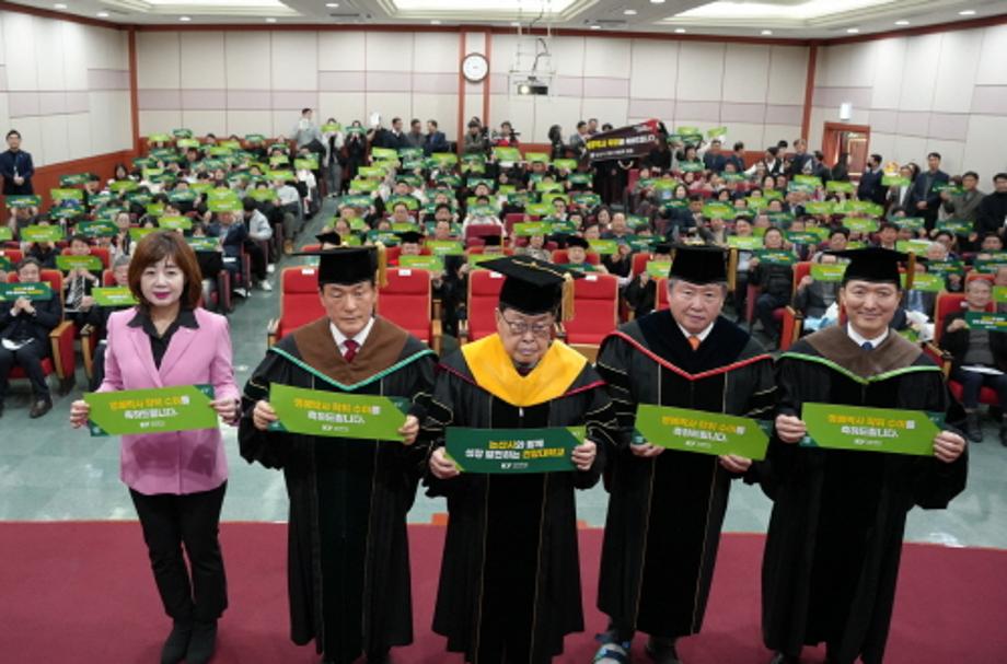 6일 건양대 논산 창의융합캠퍼스에서 열린 백성현 논산시장의 명예박사 학위수여식 모습. 왼쪽부터 두번째가 백성현 논산시장, 세번째가 김희수 건양대 명예총장, 네번째가 김용하 총장 순.jpg