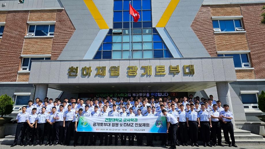 건양대학교 군사학과, 광개토부대와 DMZ 안보 체험 건양대학교(총장 김용하) 군사학과(학과장 지효근)는 전 학년 학생들의 올바른 국가관과 안보의식 함양을 위해 ‘Design Your Week(DYW)’ 기간인 5월 2일, 1군단 사령부와 파주 DMZ 평화 관광지를 방문했다. ‘Design Your Week(DYW)’는 건양대학교의 혁신적 학사 운영 개념으로, 학과별 특성에 맞는 주차를 선정해 현장 체험, 토크콘서트, 특강 등 유연한 수업을 진행하는 프로그램이다. 2010년 개설된 건양대학교 군사학과는 이번 행사에서 처음으로 지효근 학과장을 비롯한 교수 5명과 학생 100여 명이 함께 전방 1군단 사령부, 도라전망대, 제3땅굴을 찾았다. 1군단 사령부 방문에서는 1군단장(중장 주성운) 주관의 소통 시간을 통해 육군 정예 장교 후보생으로서 리더십과 책임감을 다지는 기회를 가졌다. 이어 도라전망대에서 비무장지대와 북한 개성시를 조망하고, 1978년 발견된 제3땅굴을 탐방하며 군의 대비 태세와 안보의 중요성을 체감했다. 지효근 학과장은 “이번 안보 현장 체험은 전 학년 학생과 교수들이 함께 전방 부대의 철저한 대비 태세와 국가안보의 의미를 깊이 이해하는 소중한 시간이었다”며 행사의 의의를 밝혔다.