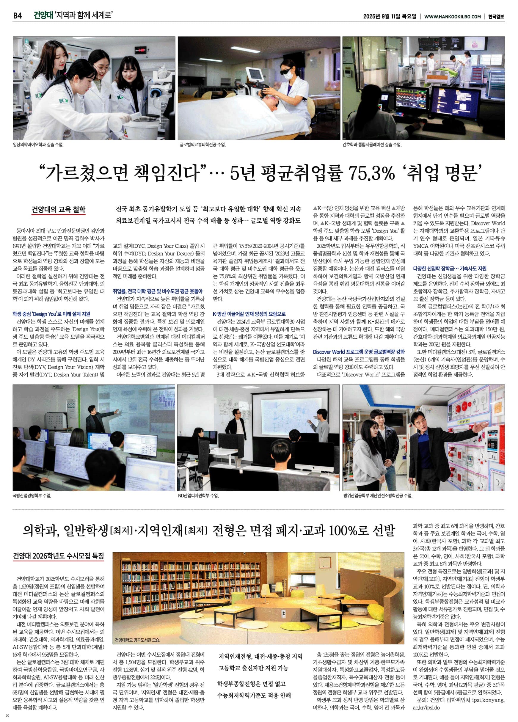 제목 | 건양대, “가르쳤으면 책임진다”… 5년 평균취업률 75.3% ‘취업 명문’(2025.09.11.) | ||||