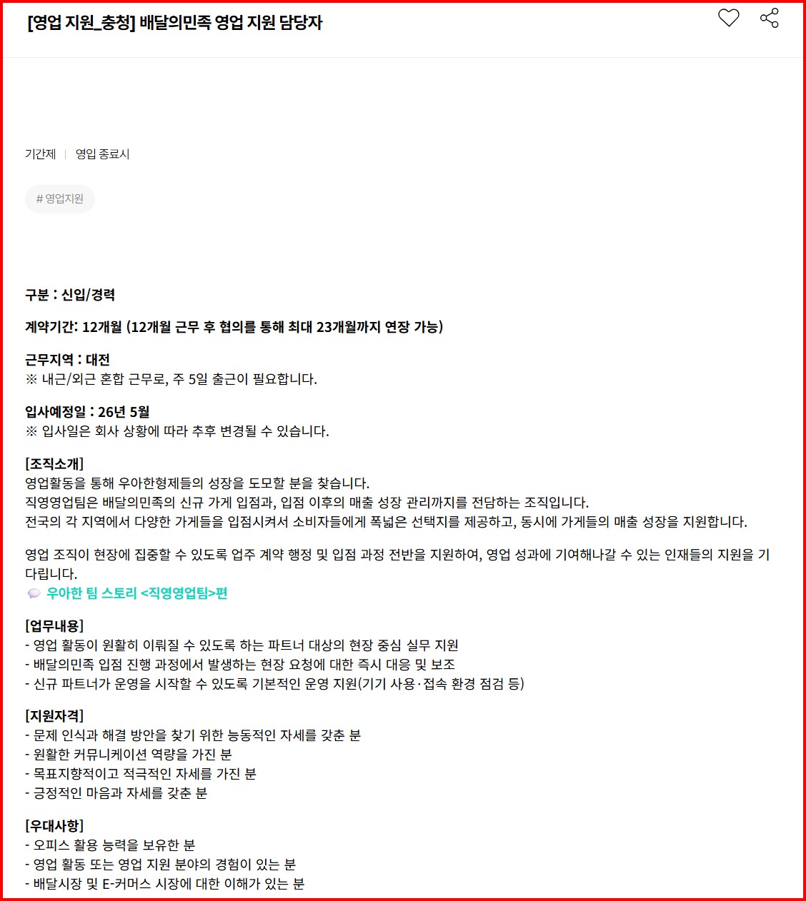 [우아한형제들]신규입점영업,영업관리,영업지원 채용 글의 상세내용